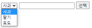 대충 이렇게 3개의 옵션이 있는 select 박스가 만들어지고, value값을 입력 받을 input, 그리고 javascript 함수를 실행시켜줄 선택 박스를 만들었다.